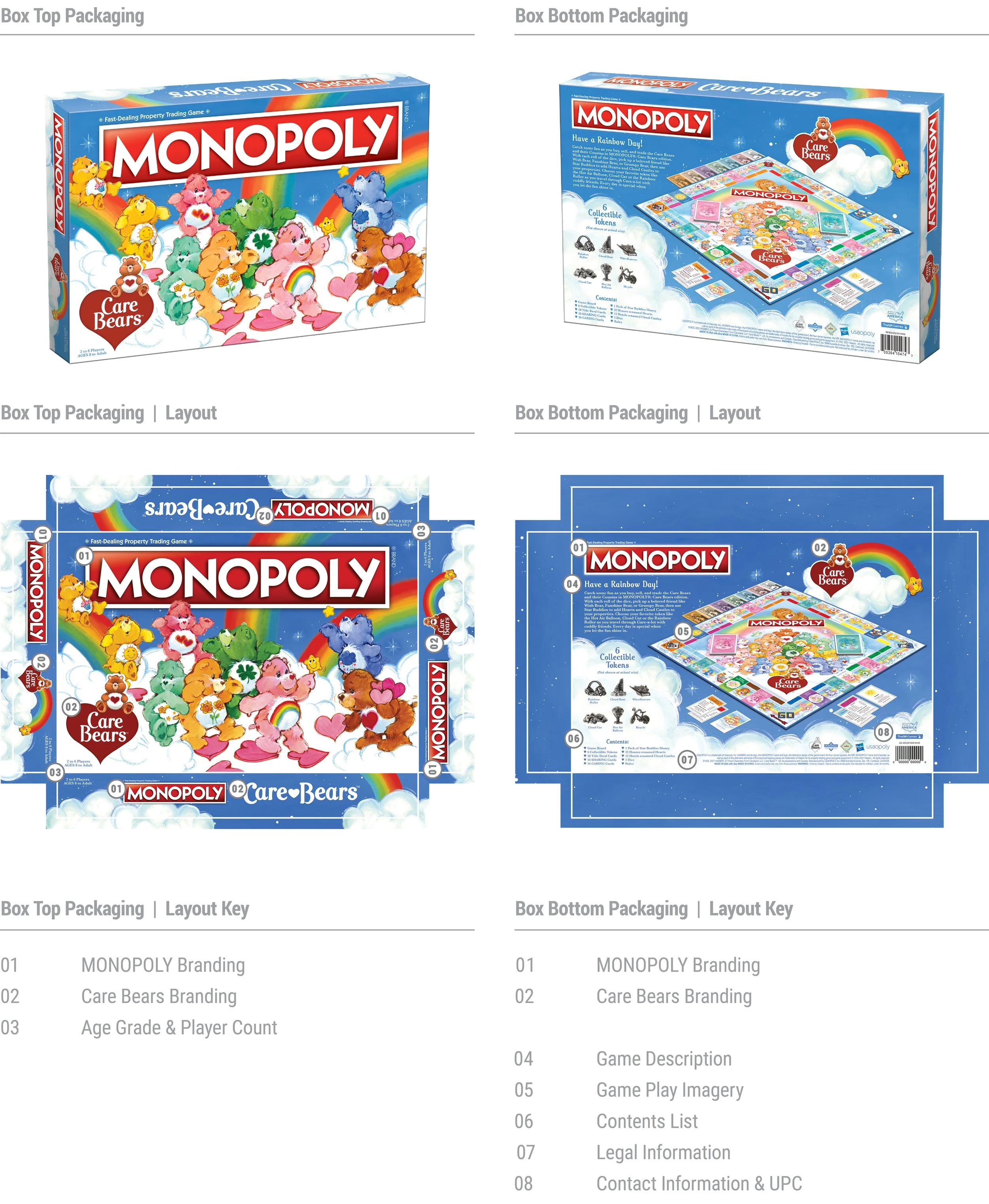 Take the classic Hasbro game into the land of Care-a-lot by transforming the standard Monopoly packaging and components into a special Care Bears edition.
