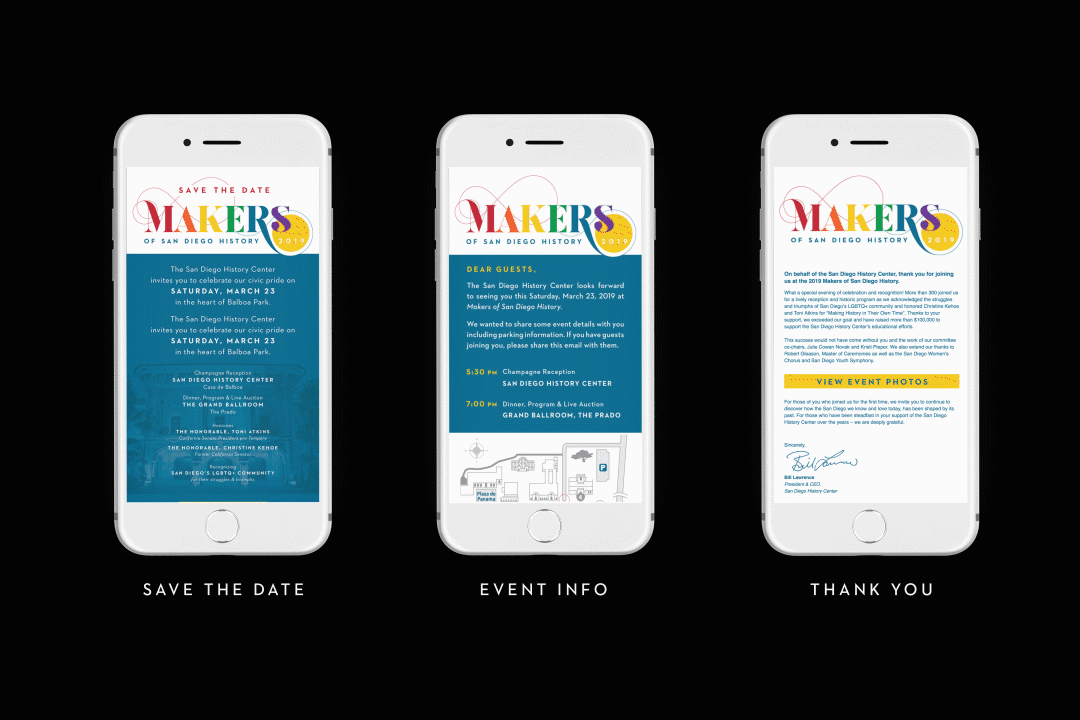 Establish event branding that represents both the San Diego History Center and its featured exhibition, LGBTQ+ San Diego: Stories of Struggles + Triumphs. Promote the night to hundreds of guests, donors, committee members and volunteers to raise money for the History Center’s LGBTQ+ educational programs.
