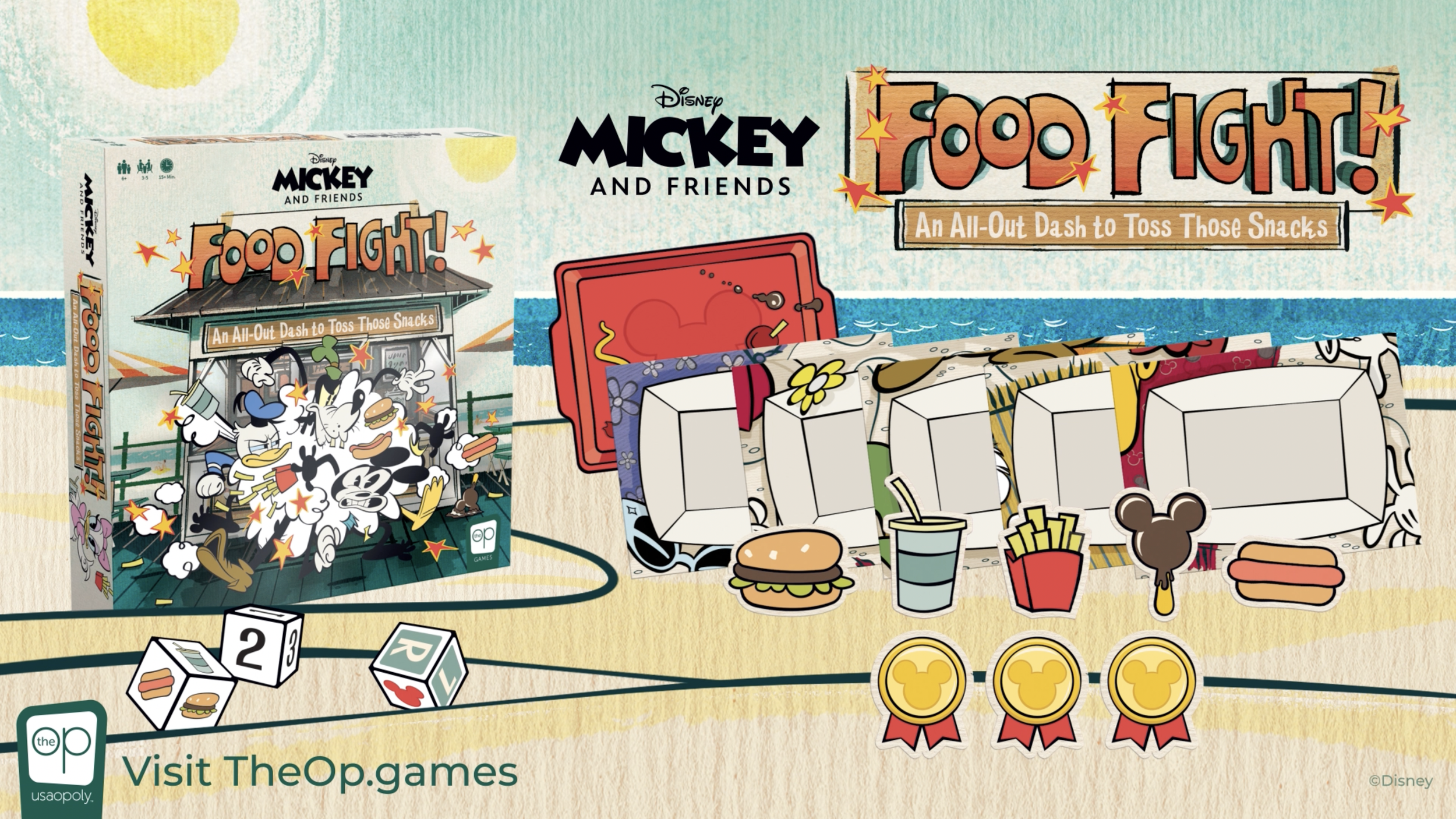 Disney Mickey and Friends Food Fight! is a multi-player, fast-paced dice game. Players get in on the chaos of concessions, as one of their favorite Disney characters, by tossing different dishes and treats from the Snack Shack to clear their tray the fastest! They must simultaneously roll the dice to follow what types of food to toss, how many, and in which direction…all while avoiding others’ food! The first player to empty their tray and be the first with three Mickey Medals wins the game!